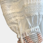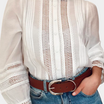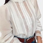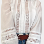 Eleva tu elegancia diaria con esta Blusa de Encaje Vicenza. Confeccionada con algodón orgánico transpirable y adornada con intrincados insertos de encaje, presenta delicadas pinzas, un volado en el cuello de oreja de madera y botones cubiertos de tela en la parte delantera. Una silueta atemporal que combina feminidad y refinamiento.