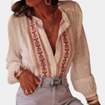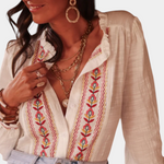 Eleva tu guardarropa con la Camisa Soleil Bohème – una hermosa mezcla de algodón y lino bordada que irradia elegancia sin esfuerzo. Con detalles vibrantes de estilo artesanal y una silueta relajada, esta blusa de inspiración francesa es tu prenda ideal para días de clima cálido, momentos en cafés y aventuras descalzas.