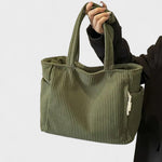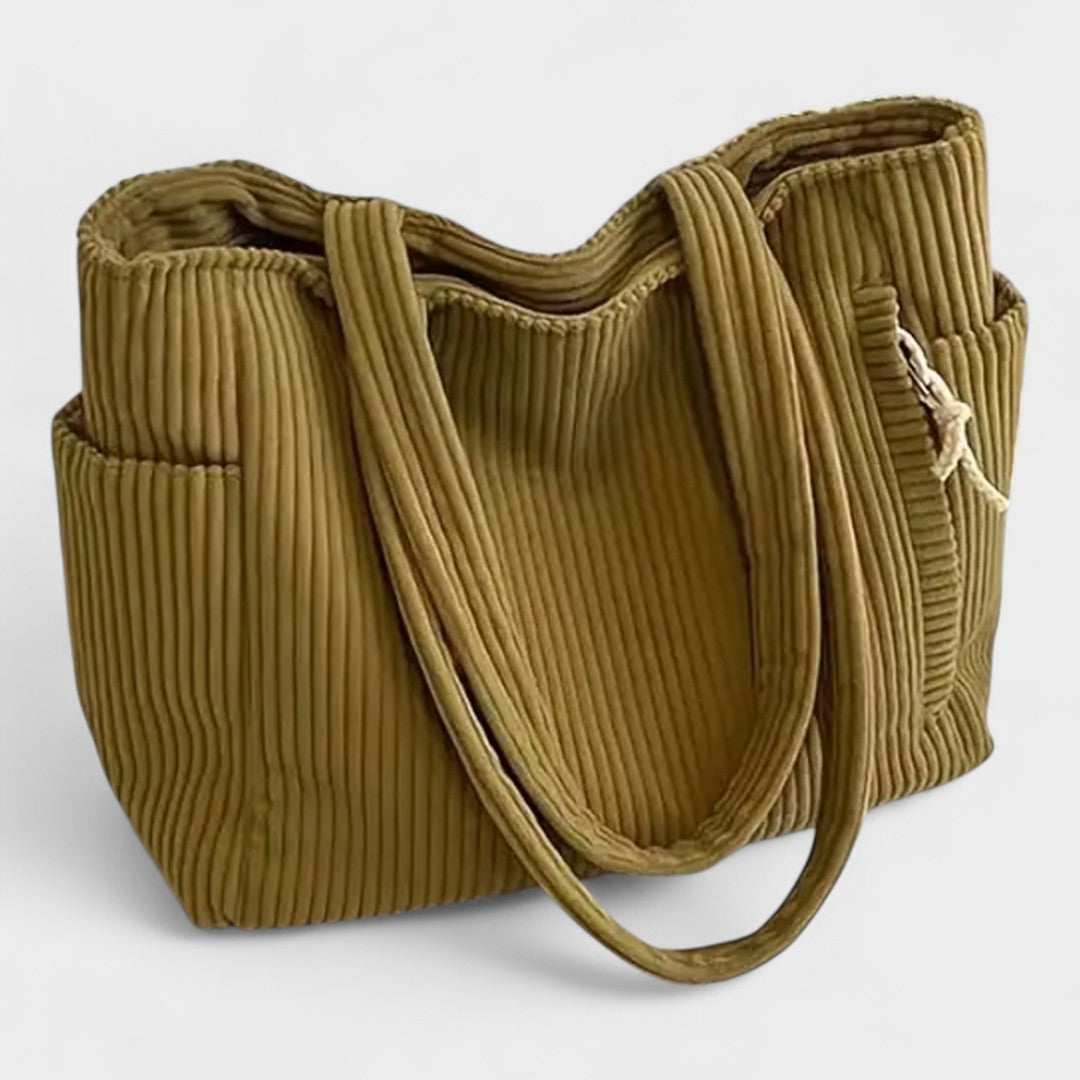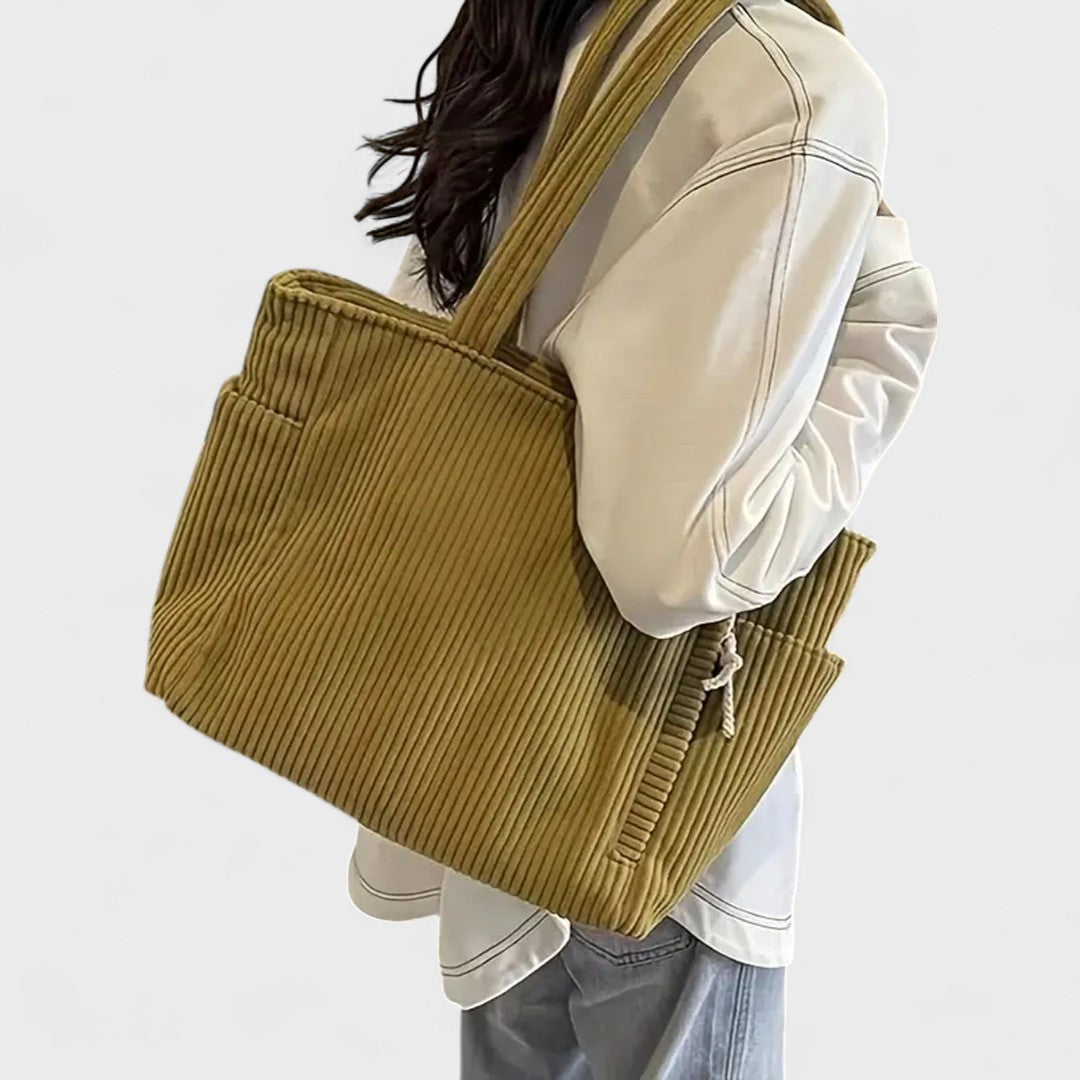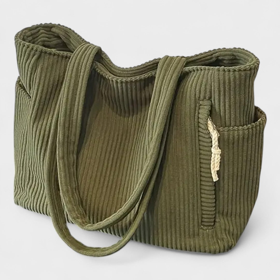Bolso tote en tejido de pana verde oliva, pensado para quienes buscan funcionalidad sin renunciar al estilo. Su diseño amplio y resistente lo convierte en el compañero perfecto para el día a día, desde el trabajo hasta los momentos de ocio.