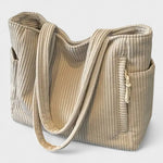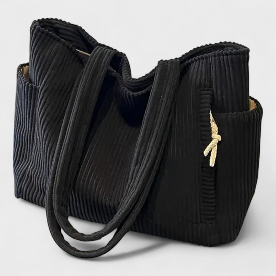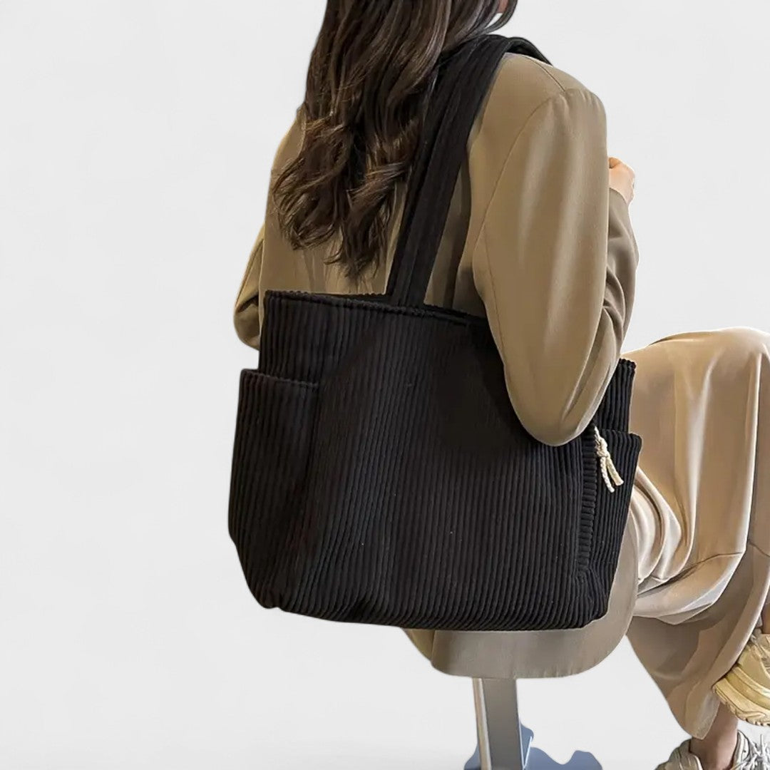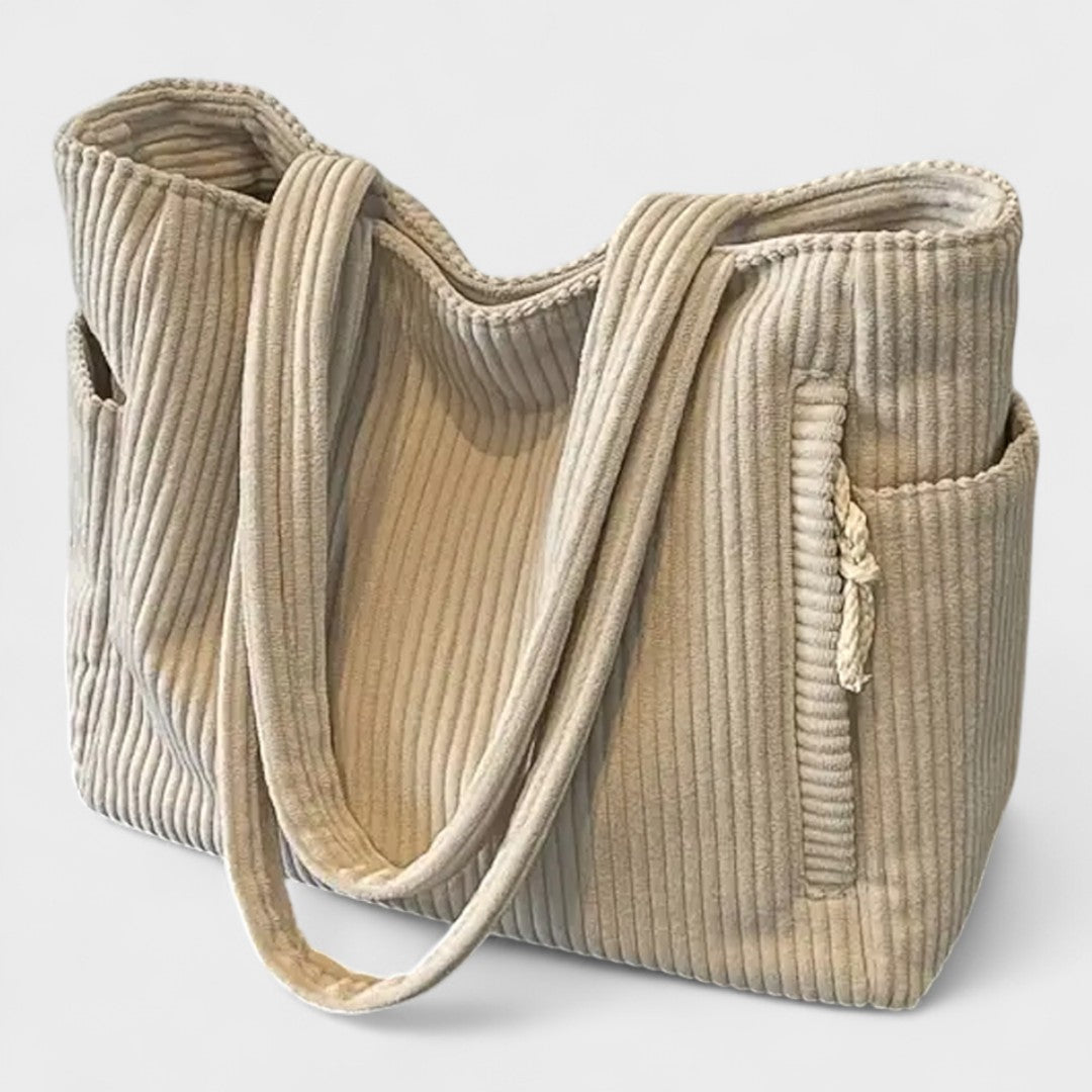 Bolso tote en tejido de pana verde oliva, pensado para quienes buscan funcionalidad sin renunciar al estilo. Su diseño amplio y resistente lo convierte en el compañero perfecto para el día a día, desde el trabajo hasta los momentos de ocio.