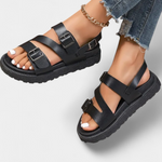 Sencillez refinada con toques modernos. Las sandalias Renée están confeccionadas en cuero vegano de alta calidad y cuentan con correas ajustables con hebilla que se adaptan con precisión a tu pie. Su diseño de punta abierta y suela plana ofrece frescura y libertad, ideal para un uso casual durante los días soleados.