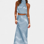 Vibrante y llamativo, este conjunto de falda está diseñado para destacar con su top drapeado de cuello halter, detalles delicados y una silueta que fluye con elegancia. Ofrece una sensación ligera y sofisticada que se mueve maravillosamente contigo.