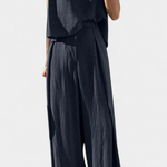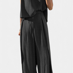 Sutil y sofisticado, el Conjunto Lauren está diseñado para ofrecer elegancia sin esfuerzo en los días más cálidos. Con un top sin mangas de corte limpio y pantalones de pierna ancha de talle alto, esta combinación fluida aporta frescura, estilo y libertad de movimiento para cada ocasión.