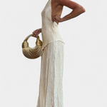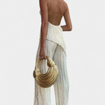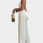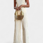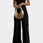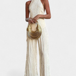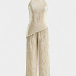 Minimalismo con impacto. El conjunto Pilarica destaca por su sofisticación moderna y textura plisada que fluye con cada paso. El top halter de corte asimétrico y espalda descubierta se combina con un pantalón de pierna ancha para lograr una silueta elongada y refinada.