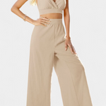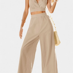 Un diseño pensado para destacar con elegancia relajada. El conjunto Valentina combina un top corto de encaje con espalda abierta y pantalones anchos de tiro alto, creando una silueta fluida y sofisticada. El escote en V y los detalles femeninos aportan un aire romántico, mientras que el tejido ligero asegura frescura durante los días más cálidos.