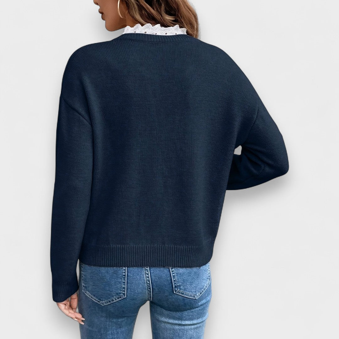 Jersey azul marino con detalle de encaje blanco en el escote, diseñado para añadir un toque romántico y sofisticado a tu estilo diario. Una prenda versátil que combina comodidad y feminidad.