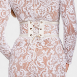 El mono Jimena fusiona sensualidad y diseño sofisticado con un efecto inolvidable. Confeccionado en encaje bordado con lentejuelas sobre una base translúcida, este diseño entallado de manga larga realza cada movimiento con brillo sutil. El cinturón ancho tipo corsé define la silueta con carácter y estructura.