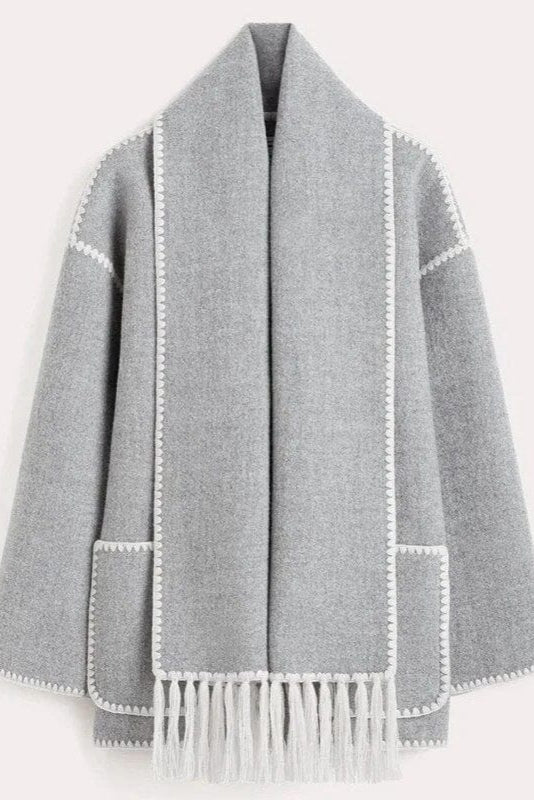 - Bufanda de flecos incorporada para mayor calidez e interés visual