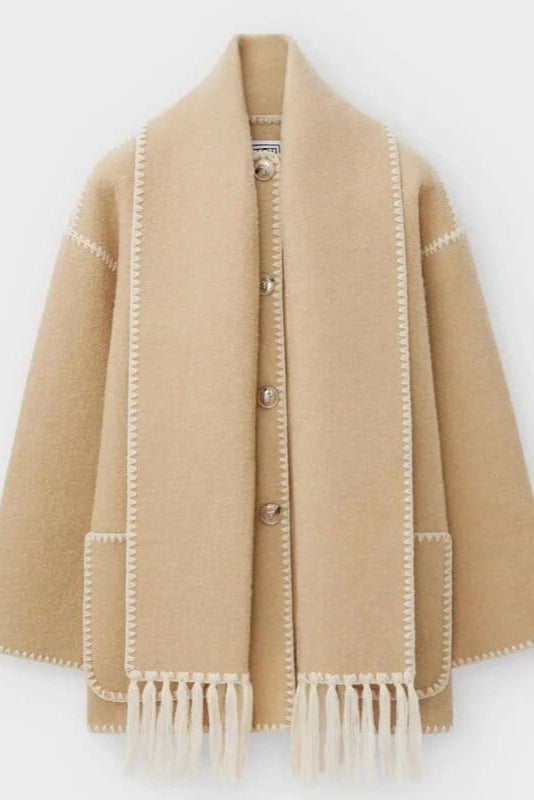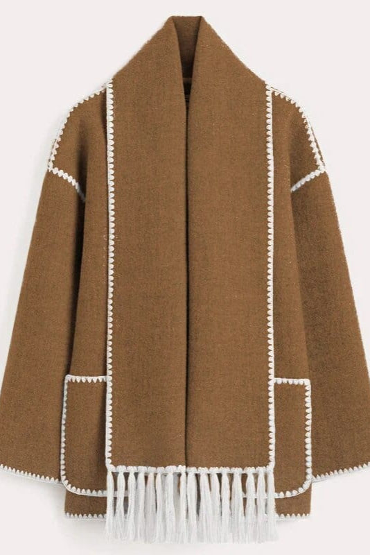 Abrigo con Bufanda de Flecos en Color Ciervo