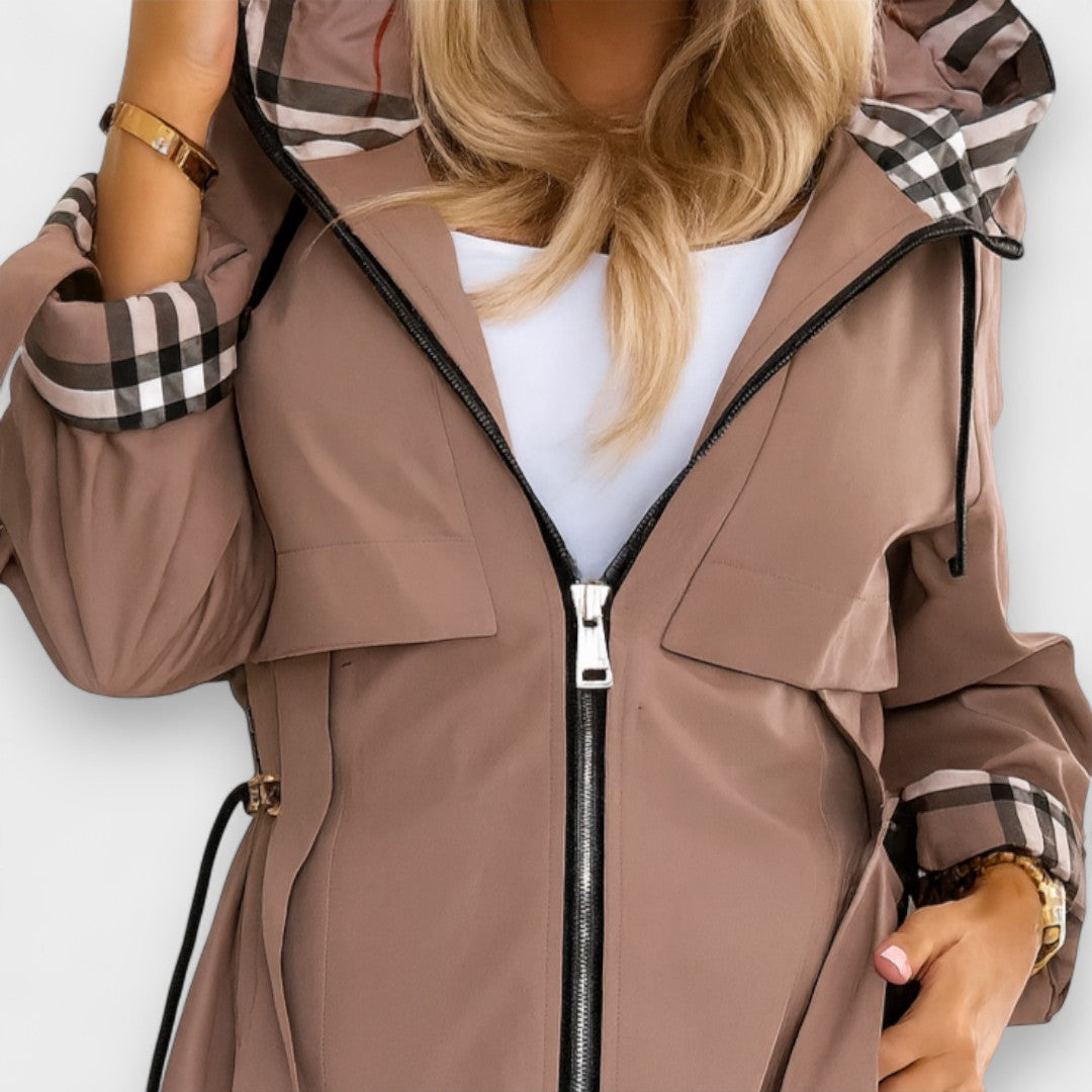 Una chaqueta diseñada para acompañarte con elegancia incluso en los días más grises. Su tono neutro aporta versatilidad, mientras que el forro interior con estampado a cuadros en la capucha y mangas añade un detalle sofisticado y atemporal.