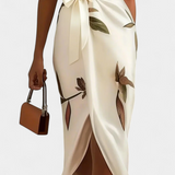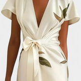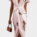 Refinado y alegre, el vestido Dhalia envuelve tu figura con su silueta entallada y escote en V favorecedor. El estampado de hojas vibrantes y el lazo lateral añaden un toque de frescura ideal para eventos al aire libre y salidas de día.