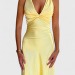 Elegante y refinado, el vestido Dolores combina un diseño sofisticado con una silueta favorecedora que destaca en cada ocasión especial. Su escote en V profundo y la cintura con torsión crean un equilibrio perfecto entre glamour y sutileza.