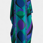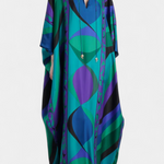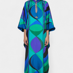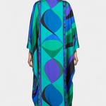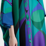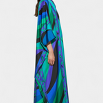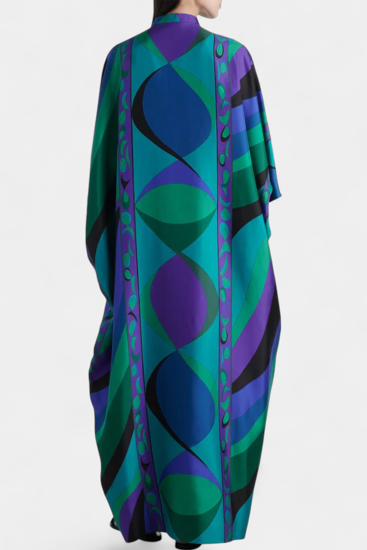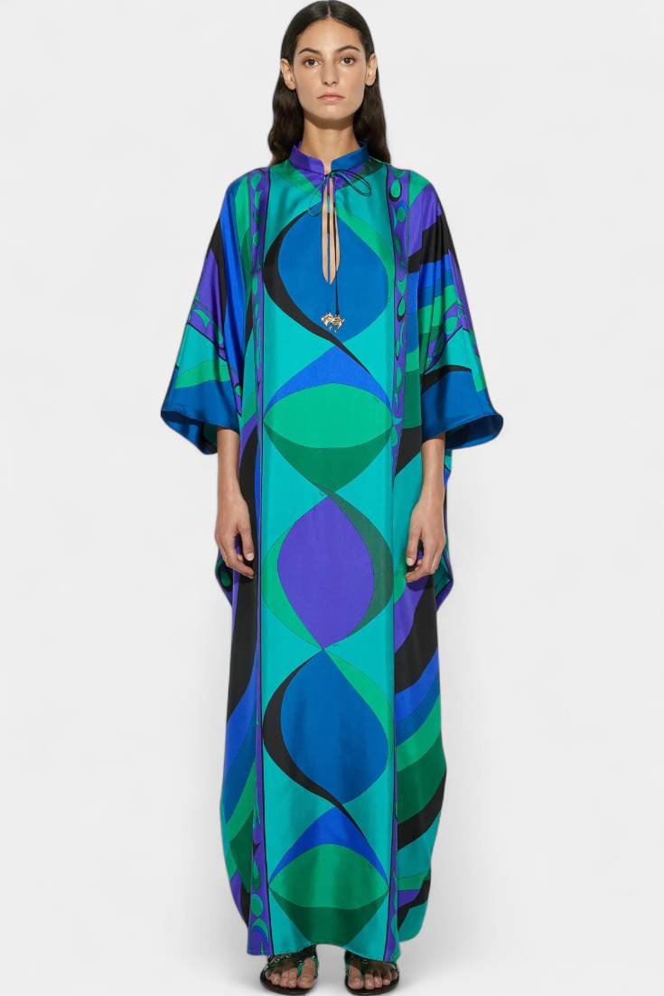 Relájate con elegancia vibrante. El kaftán Fiorella presenta una silueta fluida y relajada que se mueve con gracia y libertad. Su estampado Iride, con remolinos psicodélicos de color, transforma cada paso en una expresión artística de estilo y energía.