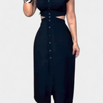 Audaz, favorecedor y con un diseño minimalista que no pasa desapercibido. El vestido Griselda reinventa lo clásico con una cintura abierta que insinúa la piel y una botonadura central que estiliza visualmente la silueta. Perfecto para llevar del día a la noche con facilidad.