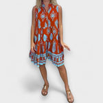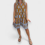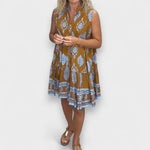 Un vestido ligero y fluido que combina un estampado bohemio único con la comodidad ideal para los días soleados. Su corte amplio y detalles delicados crean un look fresco, femenino y desenfadado.
