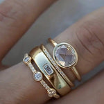 Gracioso y radiante, este conjunto de anillos de inspiración vintage combina la calidez dorada con la brillante claridad de las piedras de circonita. Ya sea usado en capas o individualmente, el diseño evoca una elegancia atemporal, perfecto para añadir un acabado refinado a cualquier ocasión.