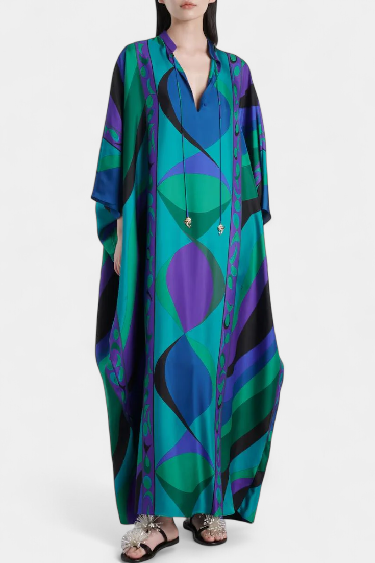 Relájate con elegancia vibrante. El kaftán Fiorella presenta una silueta fluida y relajada que se mueve con gracia y libertad. Su estampado Iride, con remolinos psicodélicos de color, transforma cada paso en una expresión artística de estilo y energía.