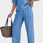 Estética bohemia con un toque natural. El conjunto Natalia destaca por su silueta relajada en lino suave, con bordados florales en relieve que aportan un aire artesanal y femenino.