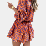 Energía vibrante con un toque despreocupado. El mono Yasmine mezcla la alegría de un vestido con la funcionalidad de un mono, gracias a su estampado ikat en tonos naranja y morado, su corte mini con volantes en capas y su silueta relajada con mangas abullonadas.